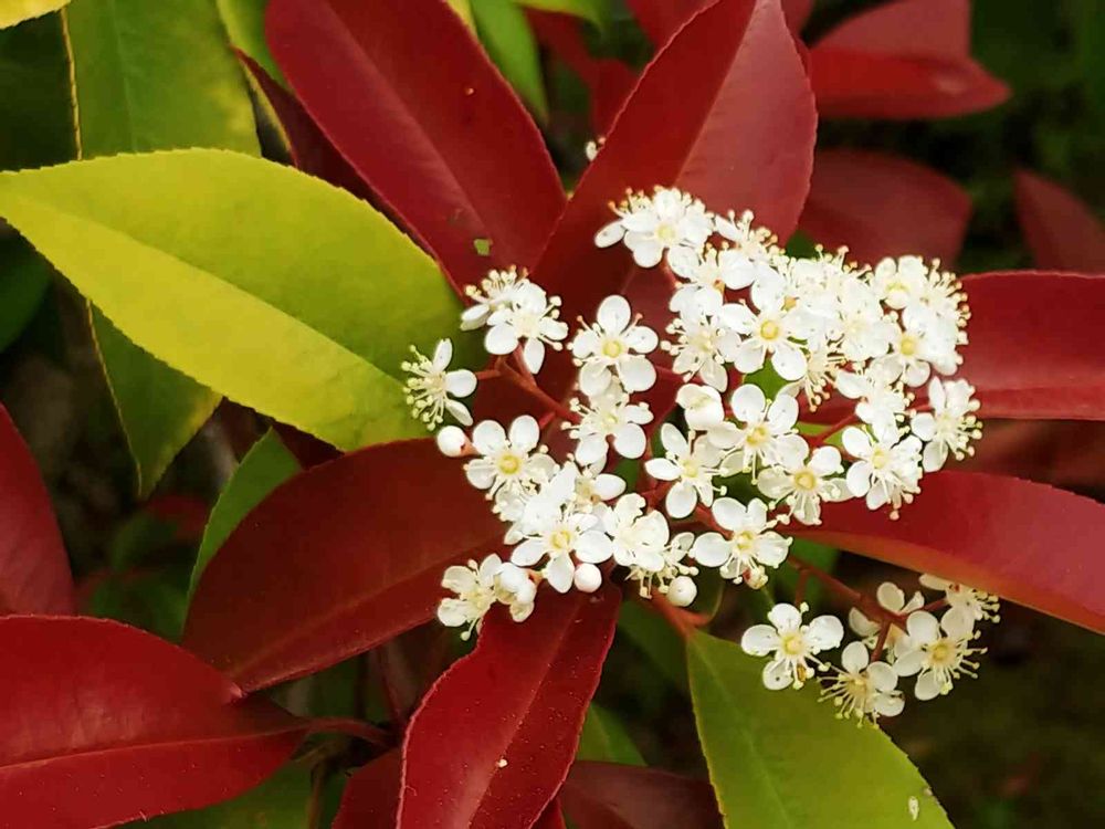 緑と赤の葉っぱ🌱と白い小さな花のコントラストが良いですね🎵