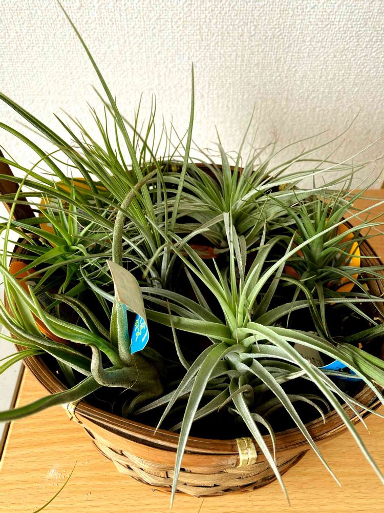 エアープランツカゴ盛り😌 今手の育て方だと蒸れてコルビィがお亡くなりになりました😭 水を溜めるような状態だとやっぱりダメだね… カゴにバークチップをたくさん敷いて置くことにしました! 外への出し入れも楽だしいっぱい詰まってて何より可愛い! 元気に育つか様子見ます😊