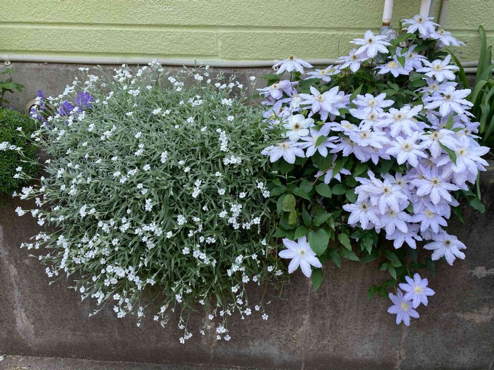 終わりかけのクレマチスの隣で、ナツユキソウが咲いてます。先にクレマチスを見ちゃうと迫力に欠けますが、可愛らしいお花ですね😊