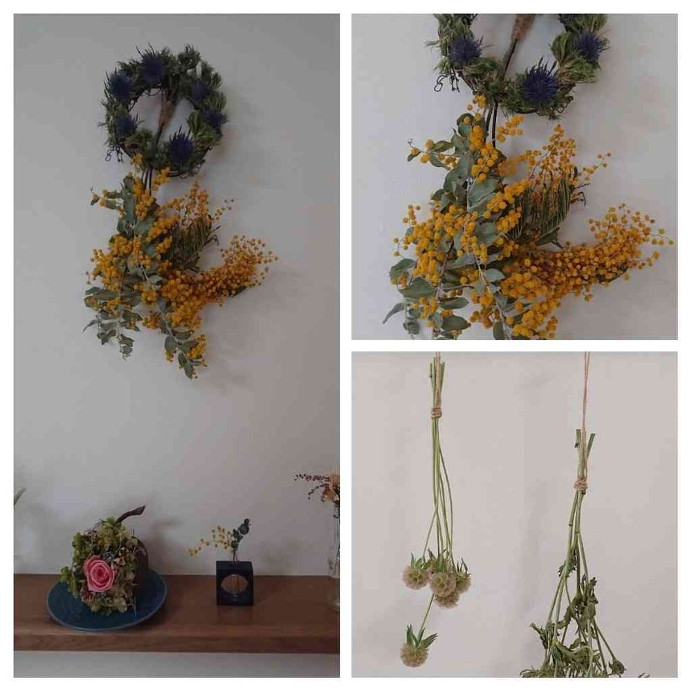 以前作った『手まりそう』と『エリンジューム』のリースと『ミモザ』がいい感じにドライになったので、スワッグにし、2つを合体させてpicに納めました
