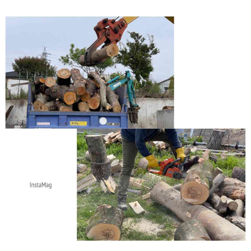 これはチェーンソーで原木カット中