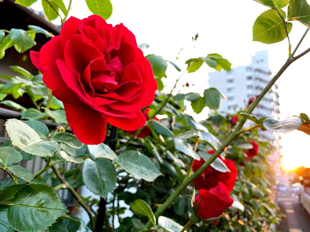 北側の大型トレリスで夕陽をバックにパパメイアン❣️しっとりとしたベルベット系の赤がキレイです😊