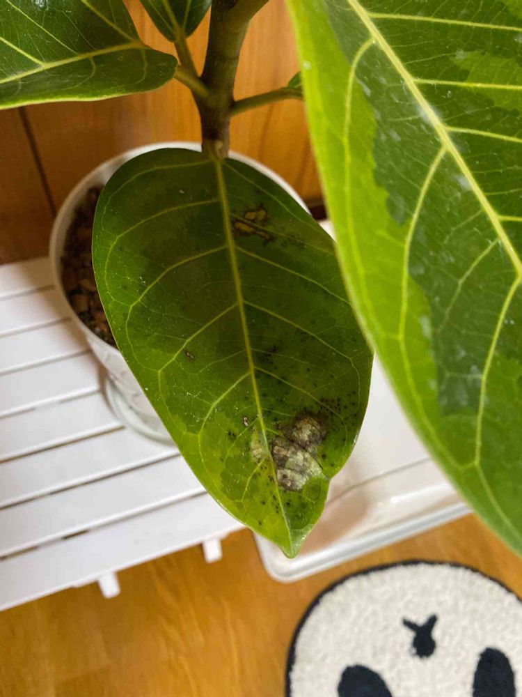 80センチ程の フィカスアルテシーマです。 買って間もないのですが下の方の葉が茶色く変色しています。害虫でしょうか?