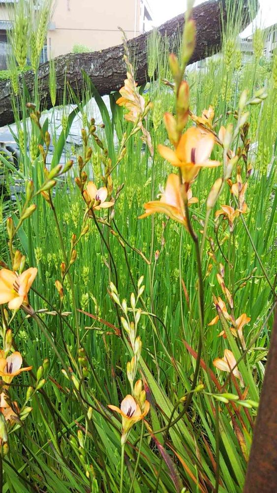 桃の木の下で、オレンジの色のトリトニアが、咲き初めました。💛