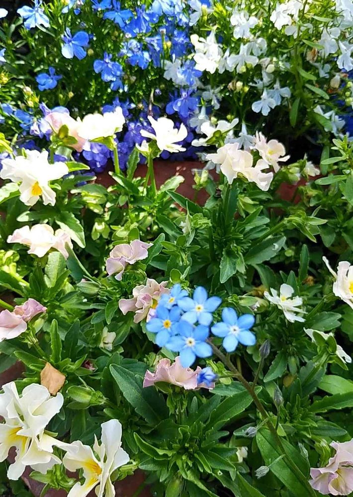 白いビオラ?の中にぽつんと忘れな草がとても可愛いですね〜😍💙