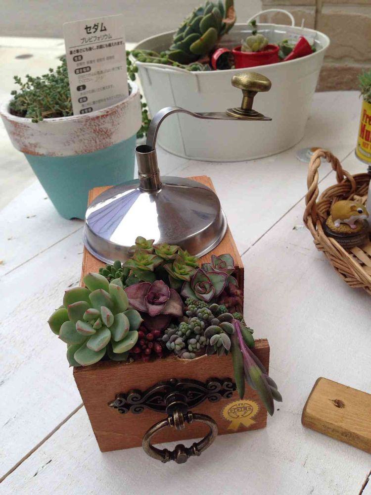 セリアリメイクのなんちゃってコーヒーミルに寄せ植え( ̄▽ ̄)