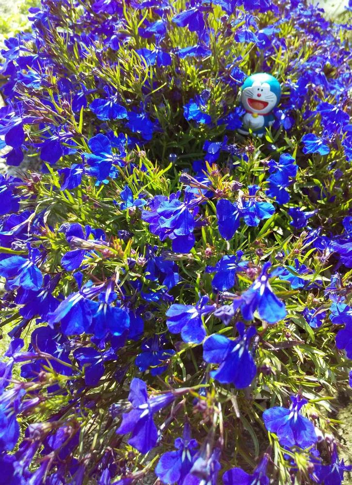もりもりのロベリアに、埋もれそうなドラちゃんが、皆さんにエール📣📣📣を、送っています🎵💜💙🍀