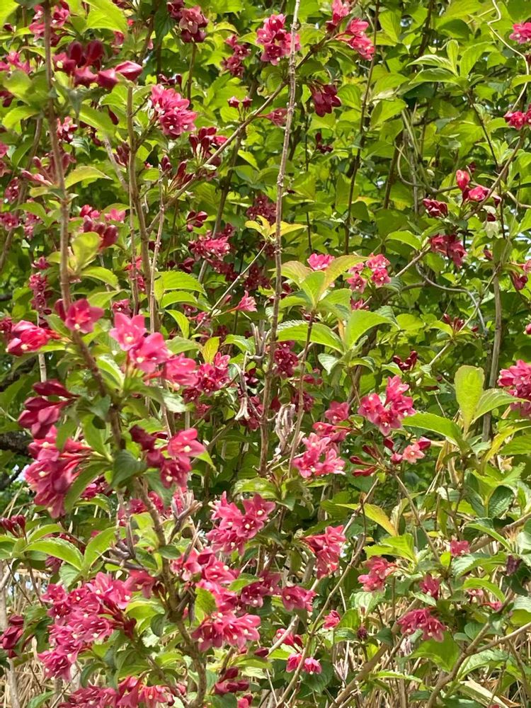 ヤブウツギです。花の色が紅に近い濃いピンク色で、白い雌しべが外に飛び出ているという特徴から、他のウツギと区別できる思います。白バナも咲いてました。生息地は関東以西の太平洋側だそうです。