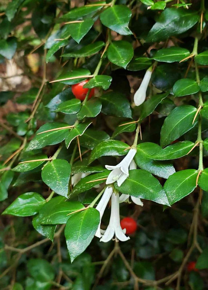 アリドオシの白い花と赤い実が一緒に見られるなんて❣️