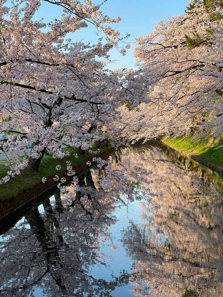 青空と満開の桜がお堀に映り、絶景の早朝お散歩清々しさが伝わってきます🏞
