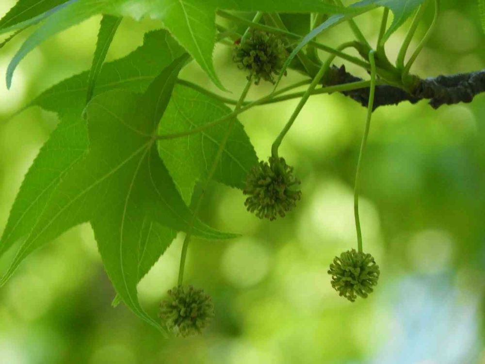 公園の緑地で、モミジバフウの若葉の間に、新しい実がが、ぶら下がっていました。