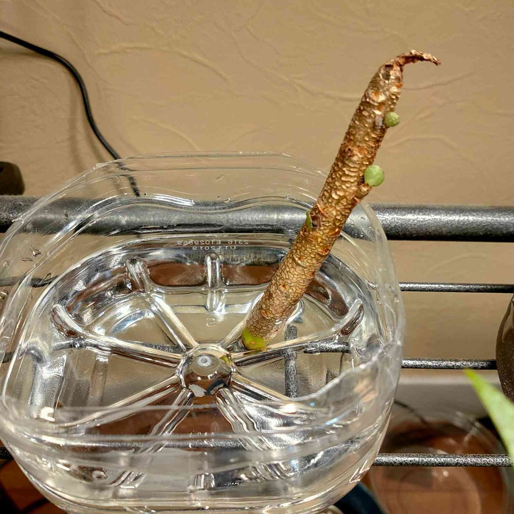 夜中に折ってしまったモロキニエンシスですが、水に浸けておくと発根するとアドバイスいただきましたので早速やってみました。