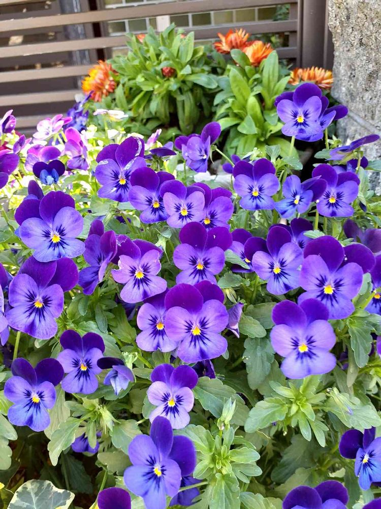 玄関前のビオラが、まだまだ元気。見ると笑顔になります🎵