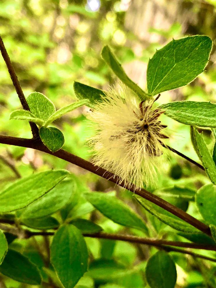 もう新芽が育ってるけど、まだしっかりと枝についているコウヤボウキの冠毛です。