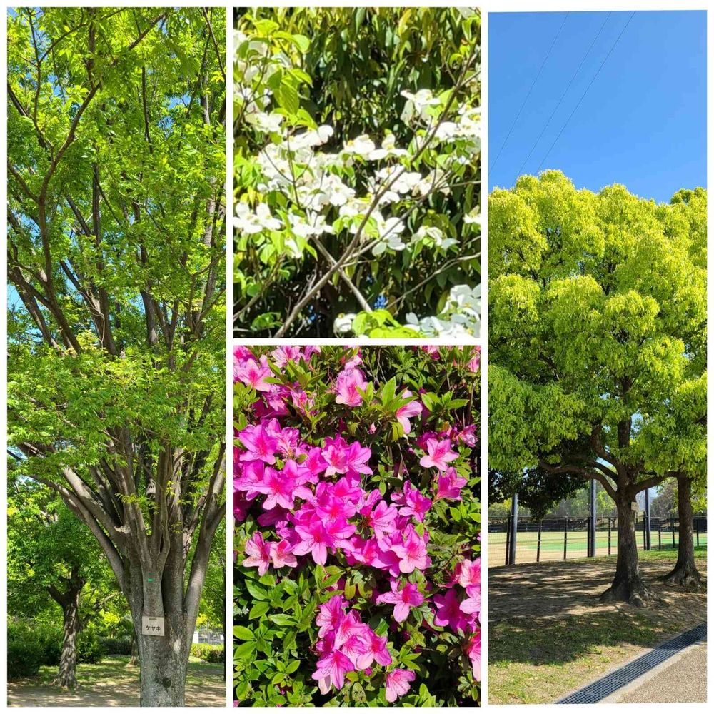 ケヤキ、クスノキ、ハナミズキ白、サツキツツジが、咲いてました。