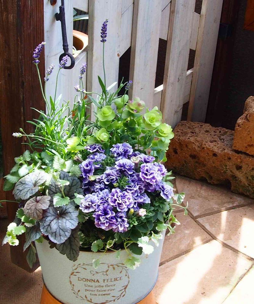 淡いブルーのブリキコンテナに♪ペチュニア プリンセ.シフォン ココの寄せ植え