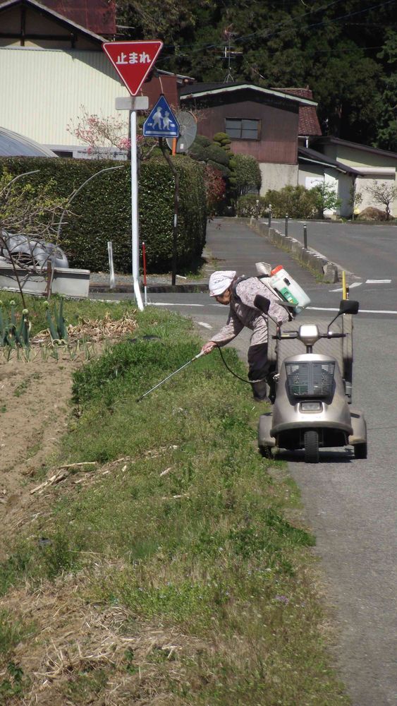 ばぁちゃん噴霧器背負って除草剤の散布中…