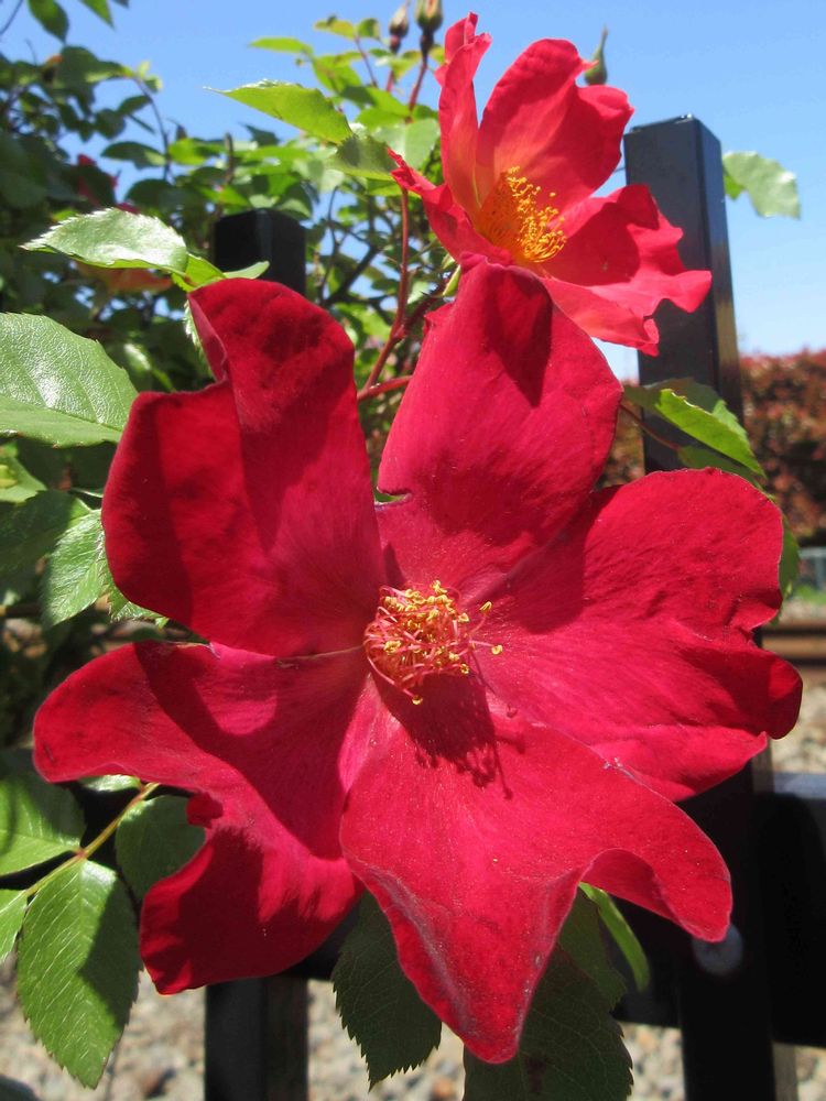 線路の柵に咲く深紅のバラ✨✨朝散歩で📷ポチッ!してきたばかりです😊