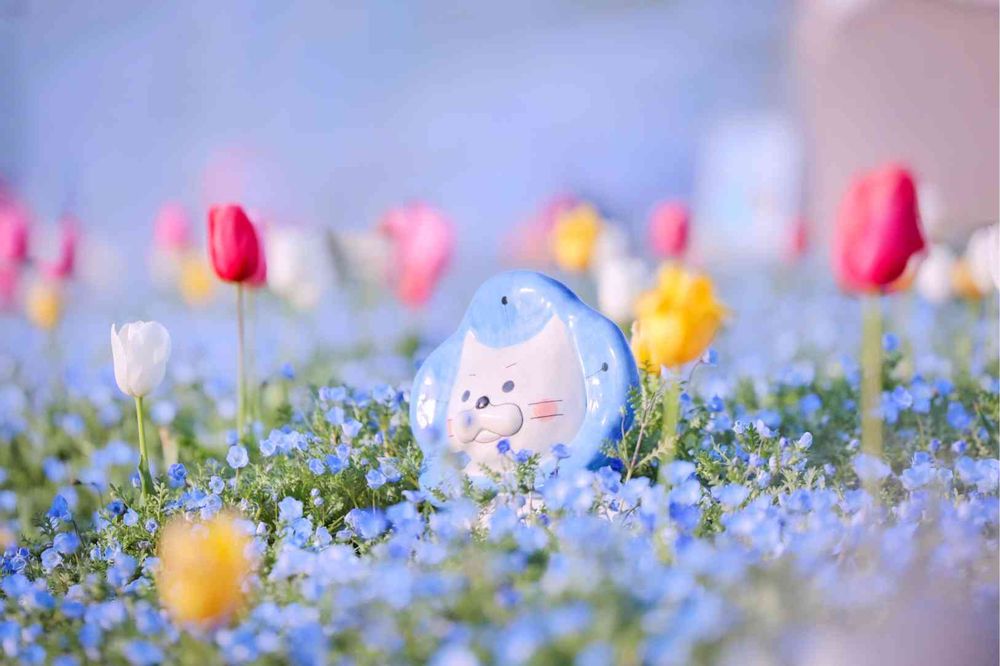 ネモフィラとチューリップの合間にマスコットキャラクターの「ネモにゃん」が可愛い…(*ฅ́˘ฅ̀*)💕