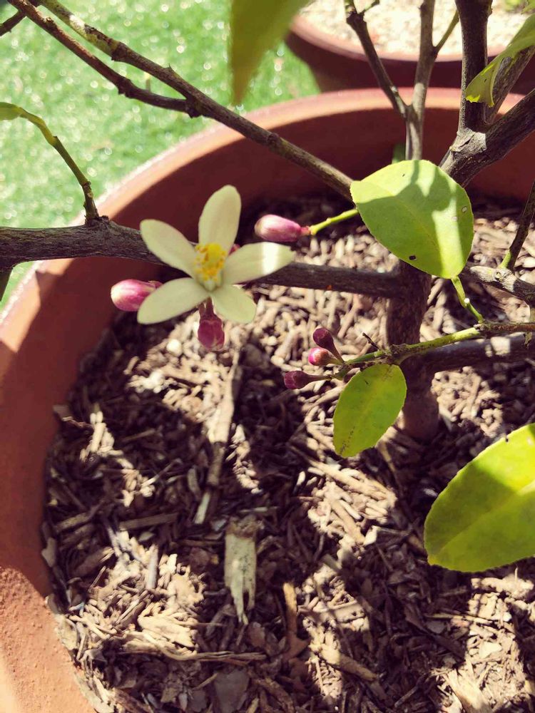 去年枯れかけたレモンを植え替えたら、今年は蕾たくさんつけました。今朝一輪咲いたのを見つけました♪
