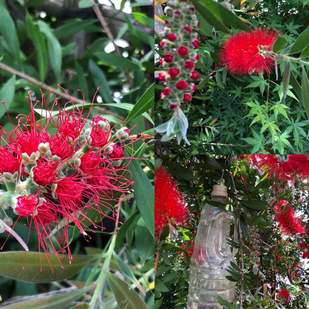 ブラシノキの開花前も凄く綺麗です。右下のペットボトルは、