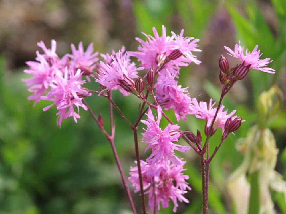 カッコウセンノウ(リクニス・フロスククリ)はナデシコ科センノウ属。ヨーロッパからシベリアの草原や牧草地に分布する多年草。花茎の先に集散花序を出し、淡いピンクの5弁花を付ける。花弁は深く切れ込んで4深裂する。葉は根生し、上部の葉は披針形で茎を抱く。