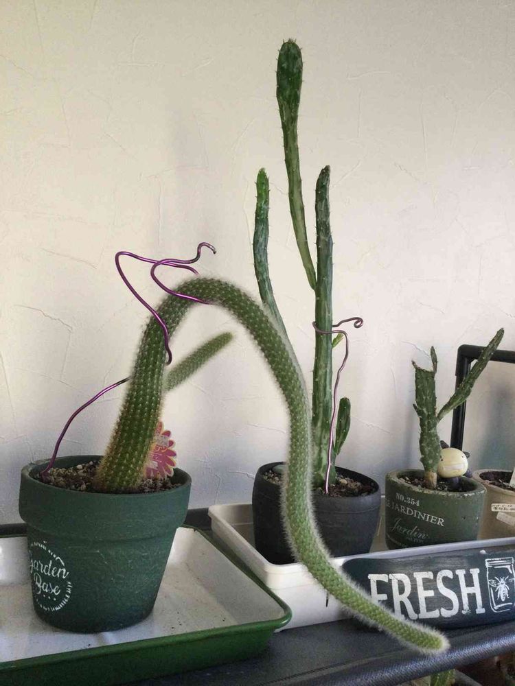 3年前にダイソー購入したサボテン🌵さん、ヒモサボテンだったのね😘。胴切りしたウチワサボテン(真ん中)は、上部の方が育ちました🥸🧐。