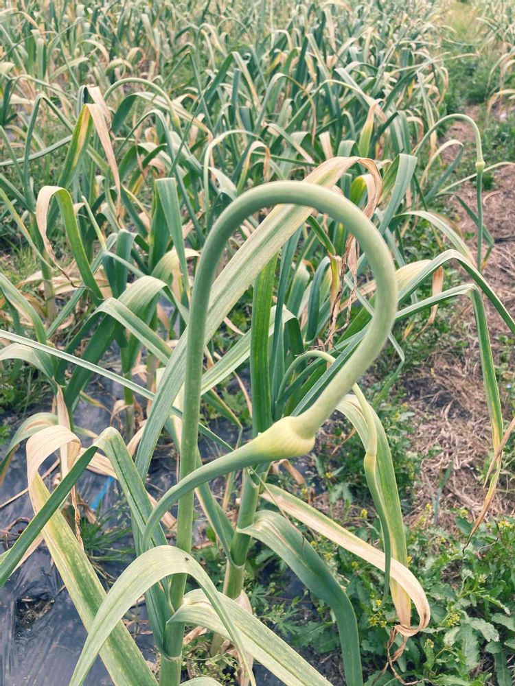 こんな鶴の首みたいなにんにくの芽かき。