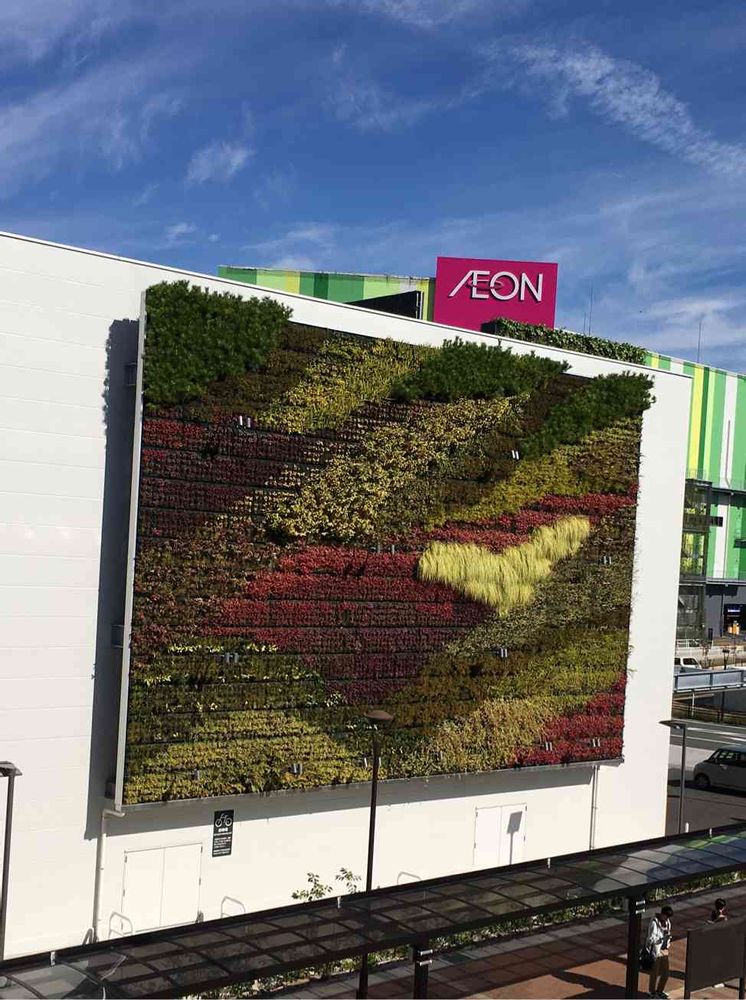 2005愛知万博が開かれていた長久手市のショッピングセンターに行く。万博時もあったがヒートアイランド対策兼ねる巨大な「壁面緑化」がされており秋空に映える。デザインとしてもとても良い。維持大変かな。