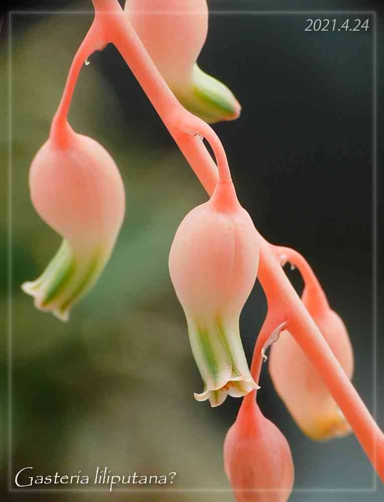 かわいいガステリアの花。ガステリアは「胃袋」の意味で、この花の形から名付けられたのだというが、胃袋じゃなくて、「おなかぽっこり」の意味合いだと思う。