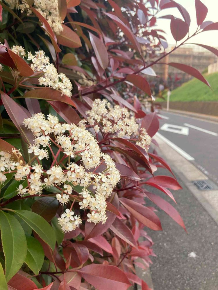 生垣が新赤に染まり…白いふんわりとした花があちこちに咲いて綺麗です✨