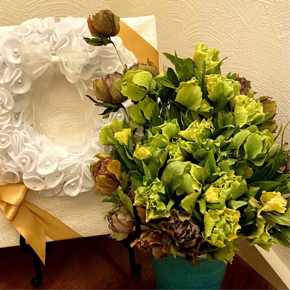 クリスマスローズのドライフラワーは初めてやったのですが、乾燥させる前よりキレイな色のグリーンになりました😊