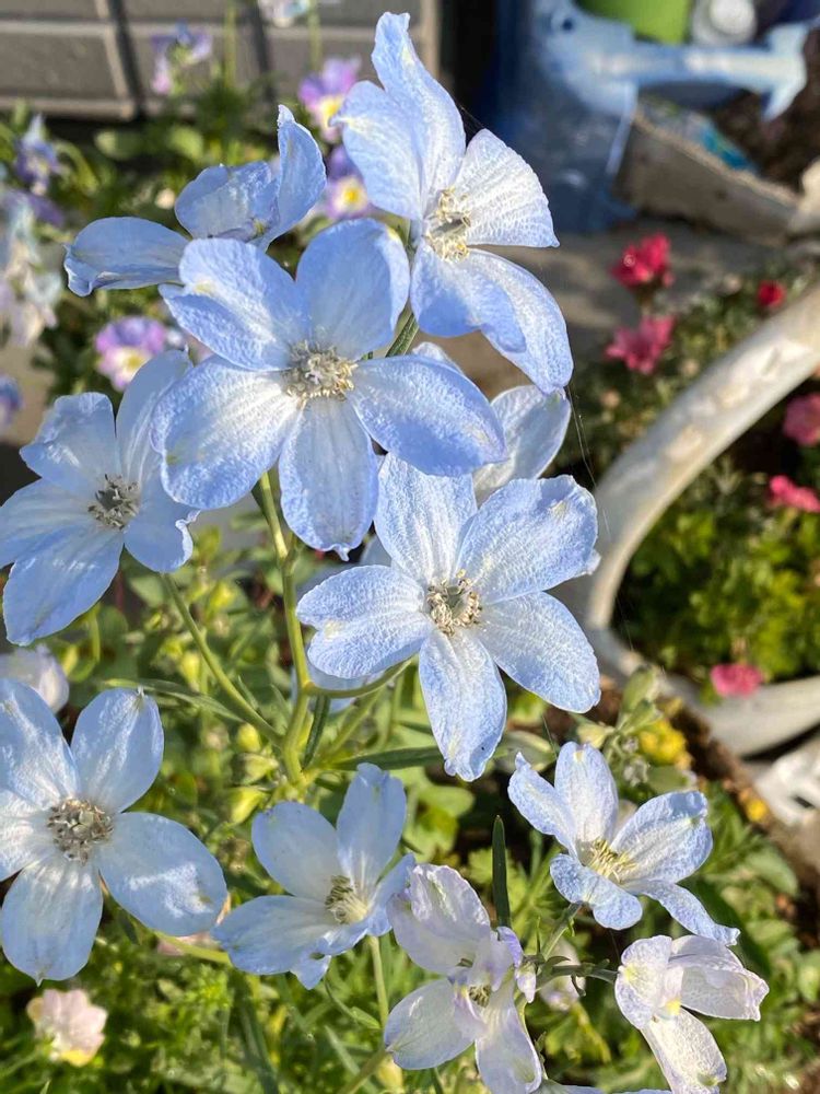 ありがとうございます😭。水色です。白も別に植えてあるんですが、合わせが難しい。ピンクも王道ですね。道の駅で安かったので、ピンクは二株もお迎えしました。
