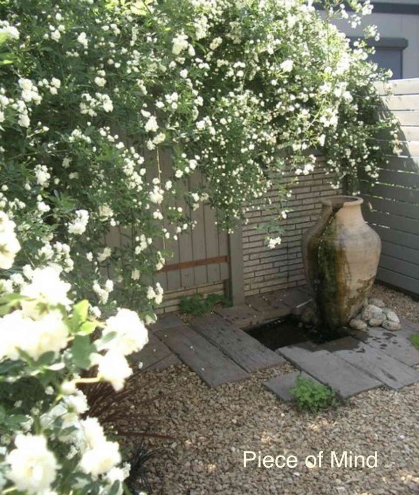 循環式で池からの水が素焼き鉢から流れ落ちる。小さな水音が聞こえる。そして白いモッコウバラ。