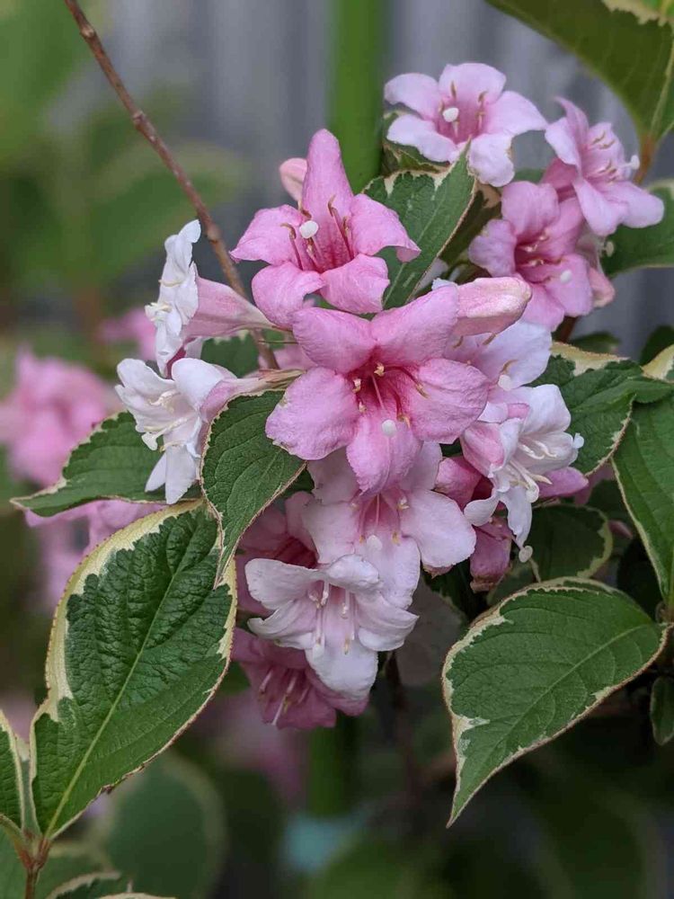 斑入りオオベニウツギとも呼ばれ、葉に斑が入ります。花は濃いピンクで次第に白く変化します。