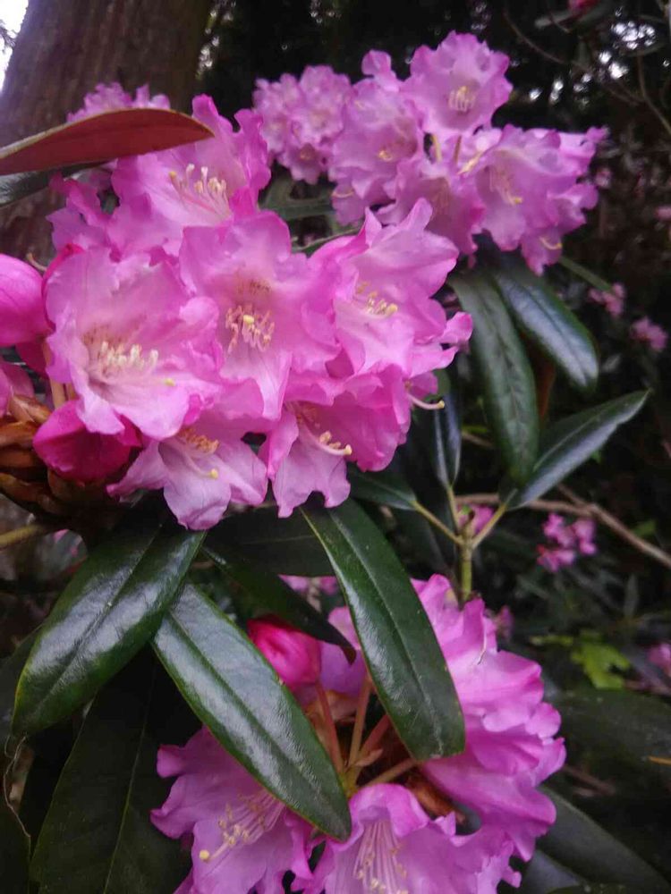 大きな枝を広げたクスノキの木漏れ日を浴びながら生きている、愛しきシャクナゲよ💕
