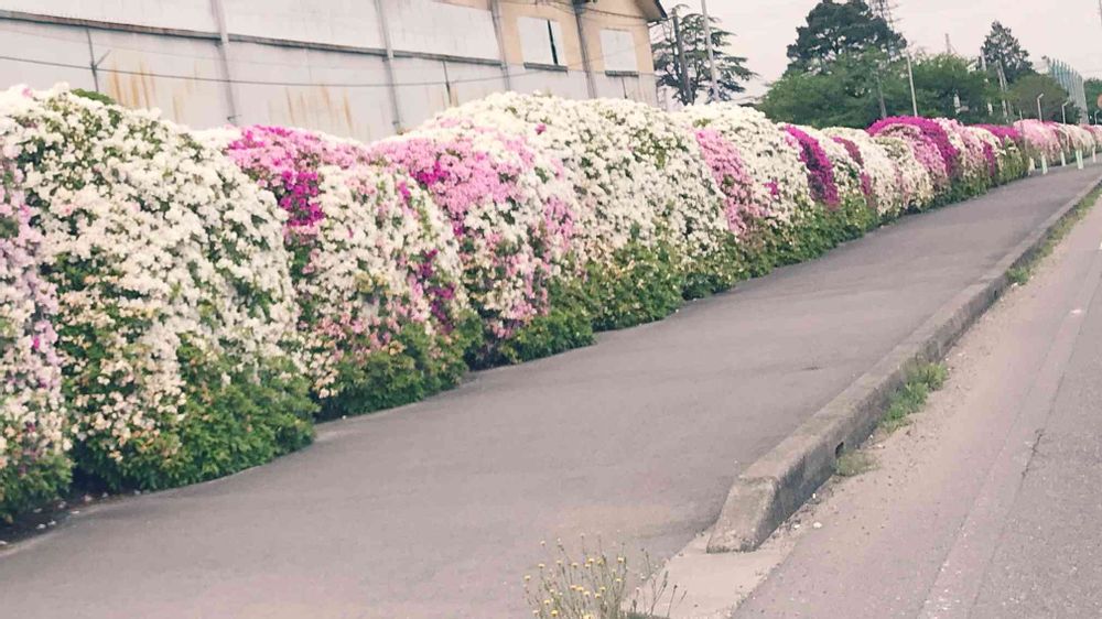 助手席から慌てて撮ったので画質が悪いけど、道の向こうまでずーーーっと大きなツツジ