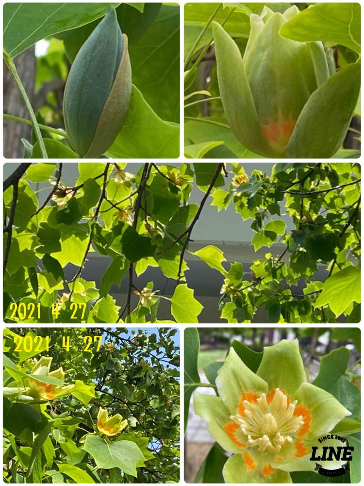 ユリの木は街路樹や公園で植えられてるようですよ。エプロンのような形をした大きな葉っぱです。花は去年は5月3日頃、今年は少し早く咲きました。