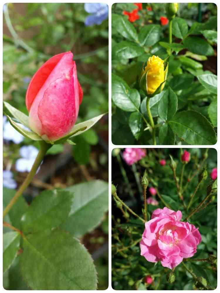 左のは、花束のバラを挿し木したもの。接ぎ木でないけど、結構元気😃⤴黄色は、数年前、見切り品棚の花姿にホの字、連れて帰ってきたもの。ミニバラは、「ほほえみ」って名前がついてました(正規値)(笑)