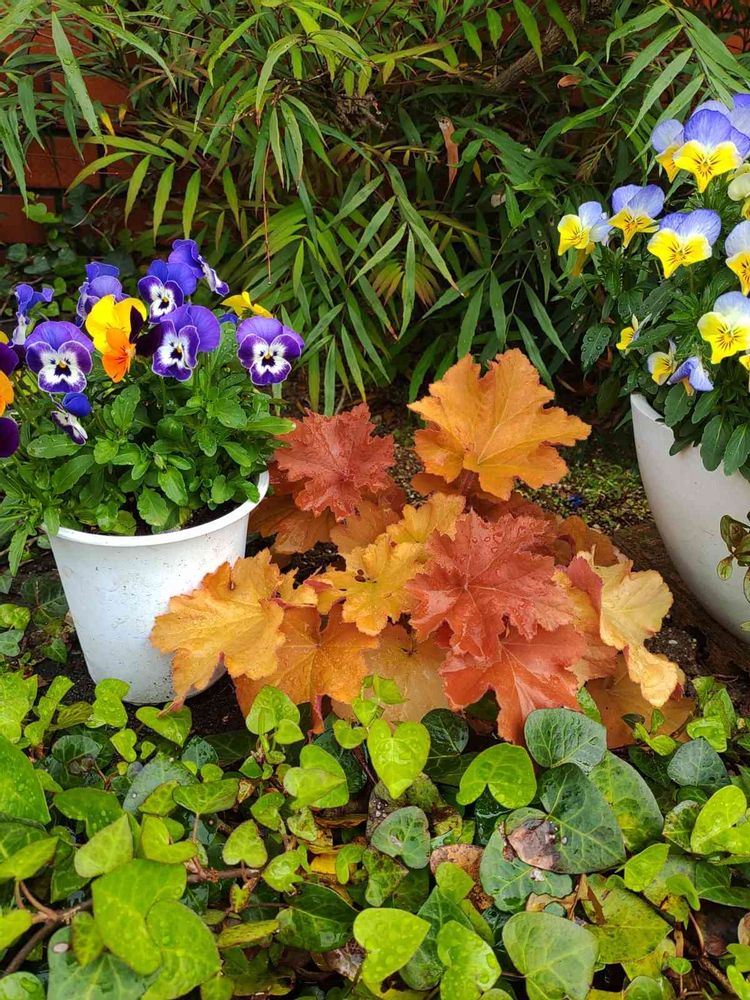 玄関は今、ビオラの鉢植えがズラリと並んでいます。が、ビオラが無くなるとがらがらで寂しくなるので、鉢植えで育てていたヒューケラを投入。
