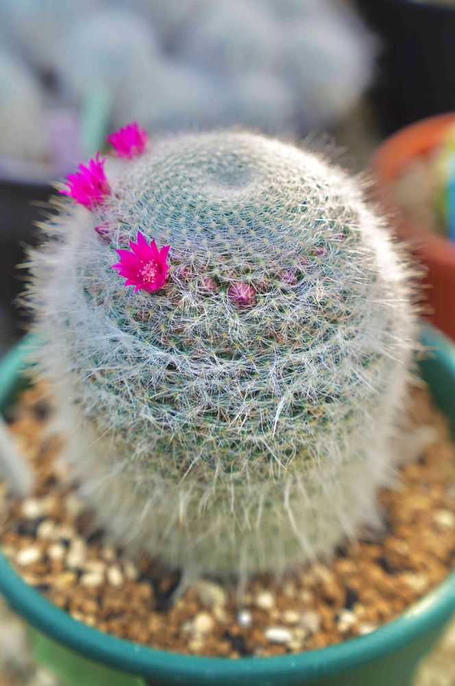 サボテンの棘が白くてフワフワな感じにピンクの小さな花