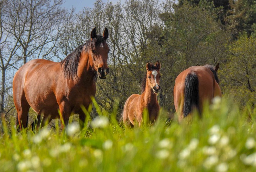 散歩道のわきにある 空いてた放牧地に 親子の馬と+2 の4頭 が 放たれました 手前の 白くボケた花は アワユキハコベ です