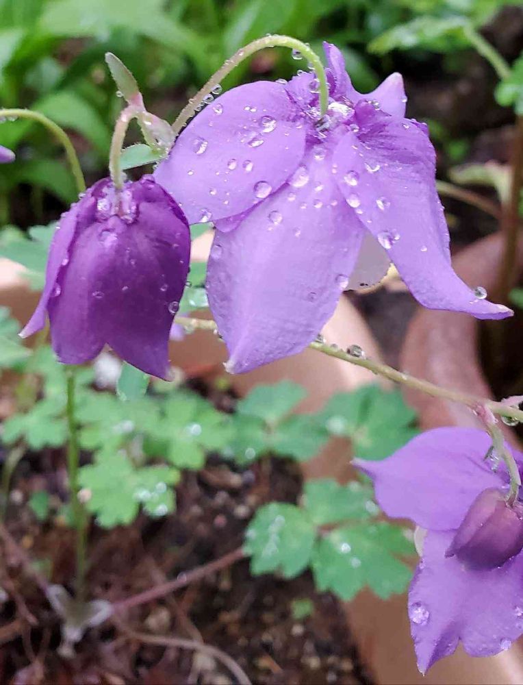 鳥のさえずりが聞こえます。オダマキに雨しずく。コロナ渦のゴールデンウィークスタートですね。