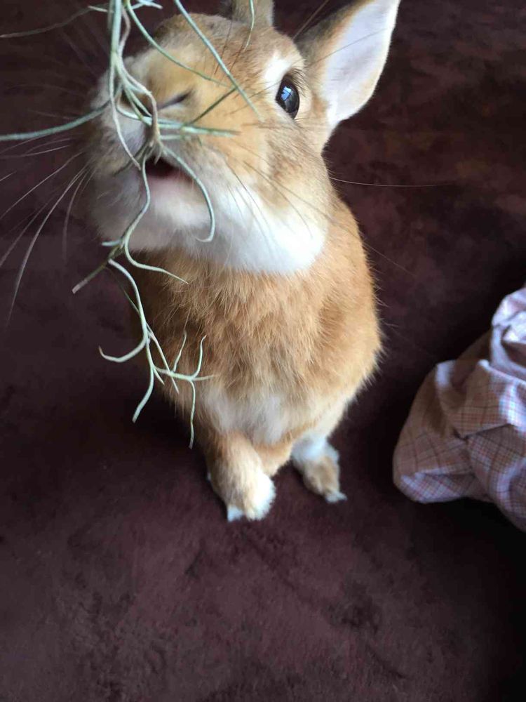 🐰<エアプランツ?ってゆーのを食べると毛がモコモコになる気がするょ✨いつも食べてるごはんと違うからワクワクもするんだ〜✨✨)