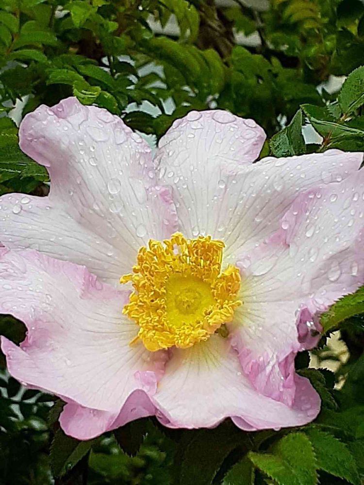 山椒薔薇🌹、一重で自然な感じの素敵な薔薇ですね。雨の中でも綺麗ですね。
