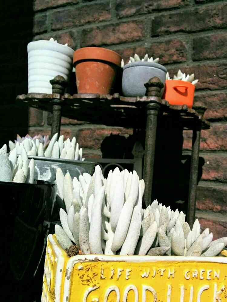 大型銀月の方は数年前に暴れ多肉50円という中から見つけたの。 最初の2年くらいはキッチンの窓際に置いといて全く 成長しませんでした。 外に出した途端すくすく伸び始めたんですよ(*^。^*)