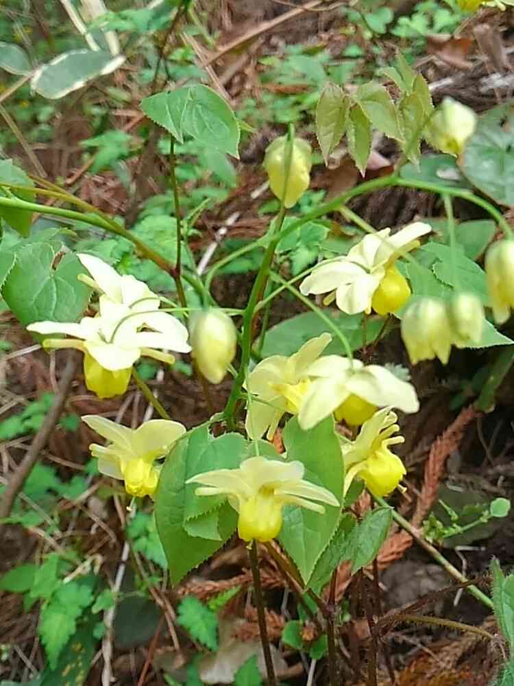 道路沿いの杉林の中にさいていました。薄い黄色のかわいい花です。