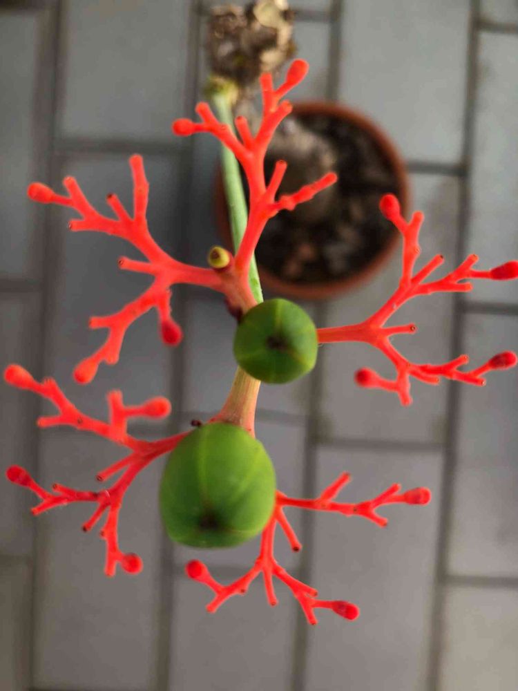 緑の丸いのが実(種)で、花はすでに散ってますが赤い所に花が咲きますよ😊