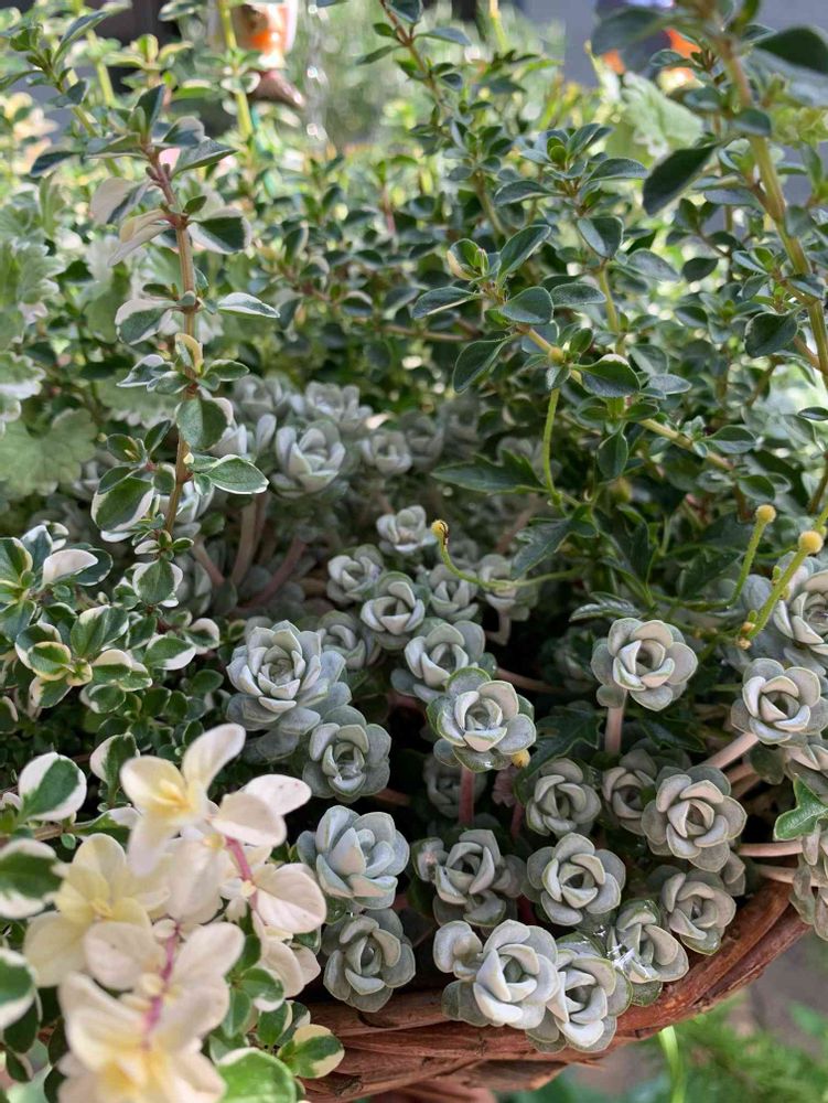 メインの「クレマチスピクシー」の花は終わってしまいましたが、「白雪ミセバヤ」、「タイム」、「グレコマ」のグリーンが馴染んできました🥰