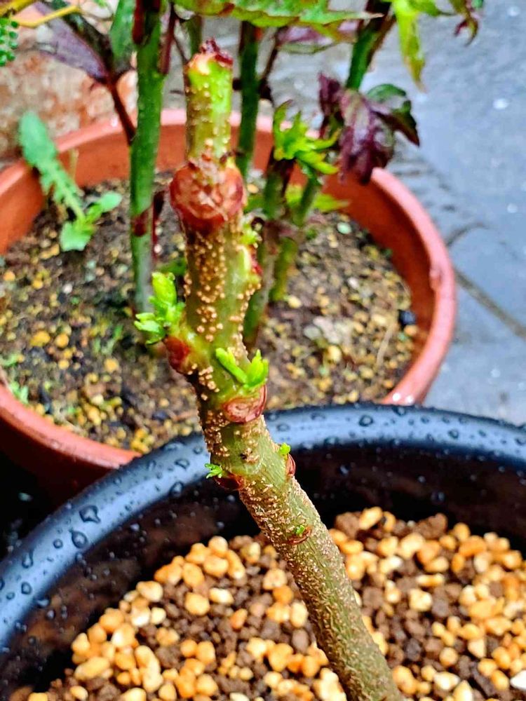 少し遅い目覚め。室内で耐えたカビ臭い土を落として、根洗いをしてから赤玉と鹿沼の配合で植えます。